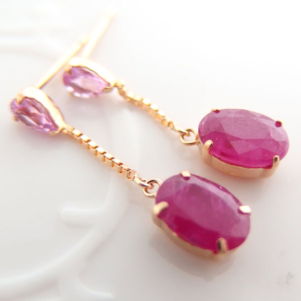 ■EXPLANATION■ 濃い色味のピンクサファイアと真っ赤なルビーをピンクゴールドチェーンで繋いだボリュームのあるブラピアスです。
